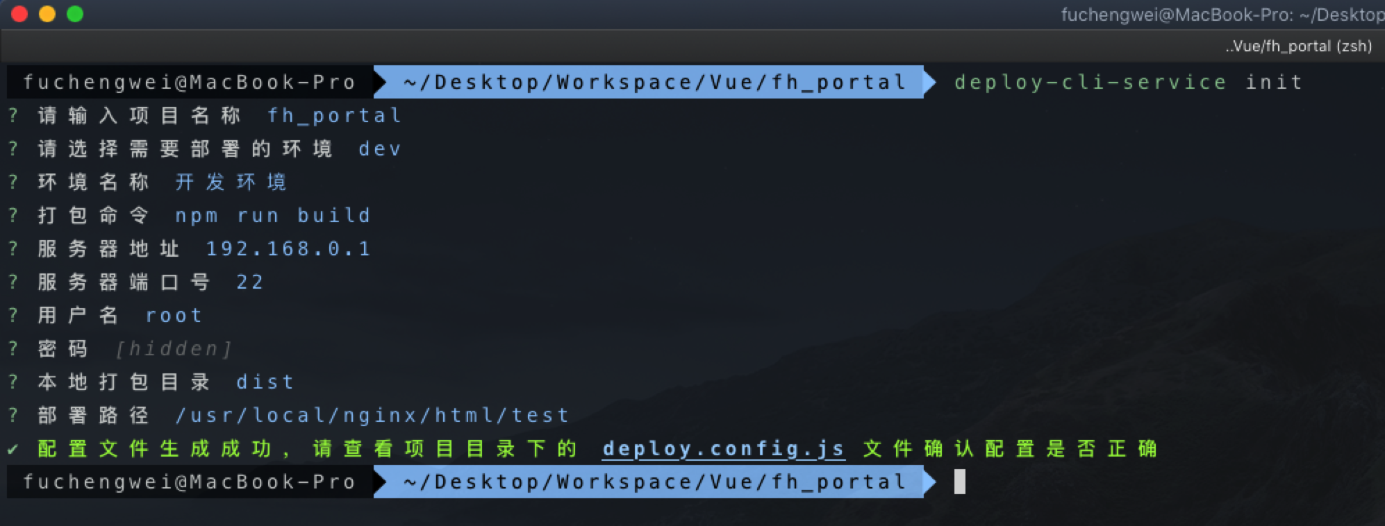 根据提示填写内容,会在项目根目录下生成 deploy.config.js 文件,初始化配置只会生成 dev (开发环境)、test (测试环境)、prod (生产环境) 三个配置,再有其他配置可参考模板自行配置。